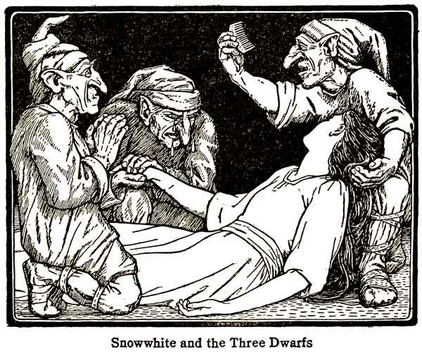 Now a great prince of the neighbouring country happened to be hunting near the hill of the dwarfs and called at their hut to get a glass of water. And when he came in he found nobody there but Snowwhite lying in her crystal coffer. And he fell at once in love with her and sat by her side till the dwarfs came home, and he asked them who she was. Then they told him her history, and he begged that he might carry the coffer away so that he might always have her near him. At first they would not do so. But he showed how much he loved her, so that they at last yielded, and he called for his men to carry the coffer home to his palace.
