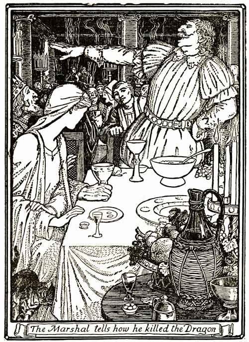 That night George went up to the king's castle and took his place at the table not far off from where sat the king with the princess on one side of him and the marshal on the other; and after the banquet the king called upon the marshal once more to tell how he had slain the Dragon with the Seven Heads. And the marshal told a long tale of how he had cut off the seven heads of the dragon, and at the finish he ordered his squire to bring in a platter on which were the seven heads. Then up rose George and spoke to the king and said, "And pray, my lord, how does it happen that the dragon's heads had no tongues?" And the king said, "That I know not; let us look and see." And the jaws of the dragon's heads were opened, and behold there were no tongues in them. Then the king asked the marshal, "Know you aught of this?" And the marshal had nothing to say. And the princess looked up and saw her champion again. Then George took out from his doublet the seven tongues of the dragon, and it was found that they fitted. "What is the meaning of this, sir," said the king. Then George told the story of how he had slain the dragon and fallen asleep in the princess's lap and had awoke and found her gone. And the princess, when asked by her father, could not but tell of the treachery of the marshal. "Away with him," cried out the king, "let his head be taken off and his tongue be taken out, and let his place be taken by this young stranger."