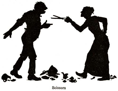 Now it happened that one day Joan was cleaning up the kitchen and, turning suddenly, she knocked two or three pots and pans together and broke them all. So Tom, who was working in the front room, came and asked Joan, "What's all this? What have you been doing?" Now Joan had got the pair of scissors in her hand, and sooner than tell him what had really happened she said, "I cut these pots and pans into pieces with my scissors."