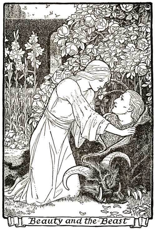 So Bella lived on in the home with the Beast and was waited on by invisible servants and had whatever she liked to eat and to drink; but she soon got tired of the solitude and, next day, when the Beast came to her, though he looked so terrible, she had been so well treated that she had lost a great deal of her terror of him. So they spoke together about the garden and about the house and about her father's business and about all manner of things, so that Bella lost altogether her fear of the Beast. Shortly afterwards her father came to see her and found her quite happy, and he felt much less dread of her fate at the hands of the Beast. So it went on for many days, Bella seeing and talking to the Beast every day, till she got quite to like him, until one day the Beast did not come at his usual time, just after the midday meal, and Bella quite missed him. So she wandered about the garden trying to find him, calling out his name, but received no reply. At last she came to the rose-bush from which her father had plucked the rose, and there, under it, what do you think she saw! There was the Beast lying huddled up without any life or motion. Then Bella was sorry indeed and remembered all the kindness that the Beast had shown her; and she threw herself down by it and said, "Oh, Beast, Beast, why did you die? I was getting to love you so much."