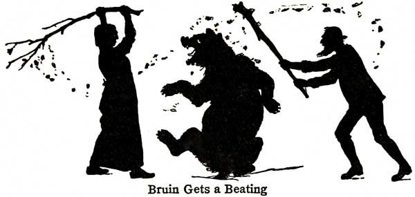 And with that Master Reynard trotted up to the man's wife and said to her, "Ma'am, there's a big black bear caught by the tail in the ice; you can do what you like with him." So the woman called her husband and they took big sticks and went down to the river and commenced whacking Bruin who, by this time, was fast in the ice. He pulled and he pulled and he pulled, till at last he got away leaving three quarters of his tail in the ice, and that is why bears have such short tails up to the present day.
