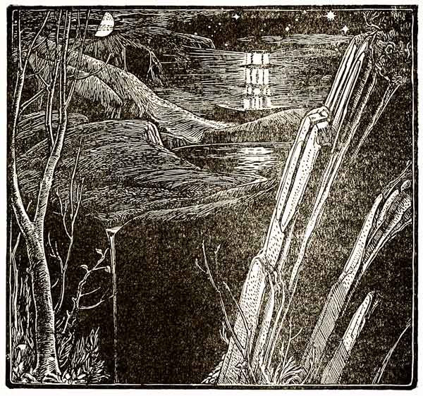 At last the king returned from the war, and his subjects told him all the news of the kingdom, and the thing they talked about the least was his wife and children. One day the king looked out of the window and saw the palace opposite furnished in a magnificent manner. "Who lives there?" he asked, but no one could answer him. He looked again and saw the brother and sister, the former with the sun on his forehead, and the latter with the moon on her brow. "Gracious! if I did not know that my wife had given birth to puppies, I should say that those were my children," exclaimed the king. Another day he stood by the window and enjoyed the Dancing Water and the Singing Apple, but the bird was silent.