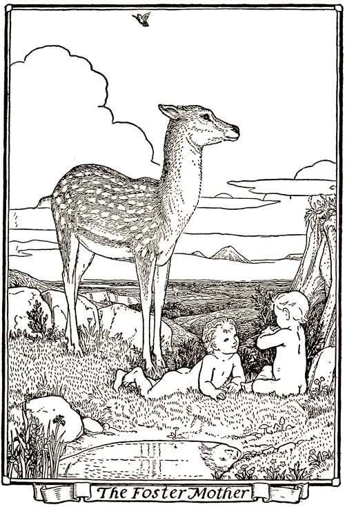 Meanwhile the nurse took the little babies, and carried them out of doors, saying: "I will make the dogs eat them up," and she left them alone. While they were thus exposed, three fairies passed by and exclaimed: "Oh how beautiful these children are!" and one of the fairies said: "What present shall we make these children?" One answered: "I will give them a deer to nurse them." "And I a purse always full of money." "And I," said the third fairy, "will give them a ring which will change colour when any misfortune happens to one of them."