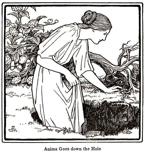 Once upon a time there was a king and queen, as many a one has been, and they had three daughters, all of them beautiful; but the most beautiful of all was the youngest whose name was Anima. Now it happened one day that all three sisters were playing in the meadows, and Anima saw a bush with lovely flowers. As she wished to carry it home to plant in her own garden she plucked at the root and plucked and plucked again. At last it gave way, and she saw beneath it a stairway going down farther into the earth. Being a brave girl and very curious as to where this could lead to, without calling her sisters, she crept down the stairs for a long, long way, till at last she came out into the open air again in a country which she had never seen before, and not far away, in front of her, she saw a magnificent palace.