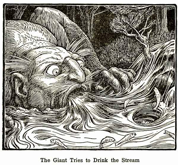 When the giant came up to the stream and tried to make Dapplegrim swim through it he would not; and then he lay down on the bank of the stream and commenced to drink up as much of it as he could. And he drank and he drank and he drank, till at last he swallowed so much that he burst; and that was the end of the giant.