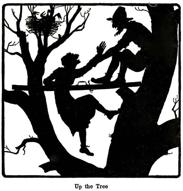 "That's a comfortable tree there; let us roost in the branches like the birds." So they took the door up with them and laid down to sleep on it as comfortable, as comfortable can be.