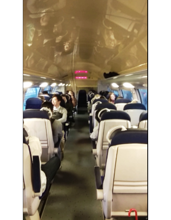 Наш поезд. Ух ты! Два этажа, лесенки, переходы, мягкие широкие кресла. Интересно, почему в самолетах экономят пространство между сиденьями, а в поезде нет? Больше бы перевезли. Видимо те, кто занимается авиаперевозками более жадные и бездушные.