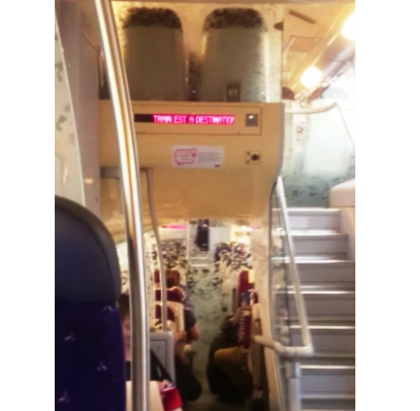 Место для пенсионеров – ну прямо пост наблюдения. Вид на первый этаж полувагона, лесенка на второй. Бегущая строка.
