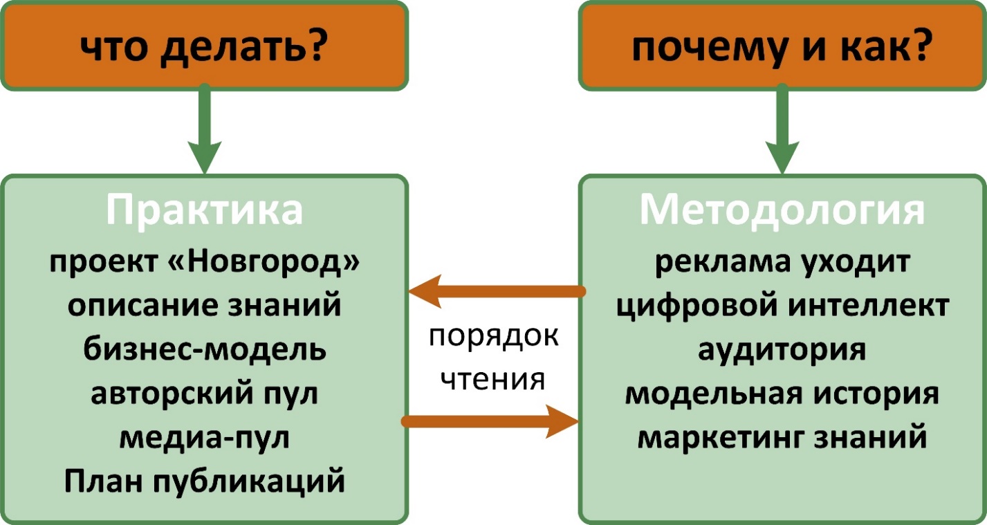 Будет отлично, если читатель реализует свое желание и перейдет к дискуссии с автором. Особенно, в вопросе выбора инструментария для трансфера в новую эпоху. К примеру, неплохо обсудить особенности маркетинга знаний в бюджетных организациях или у фрилансеров.