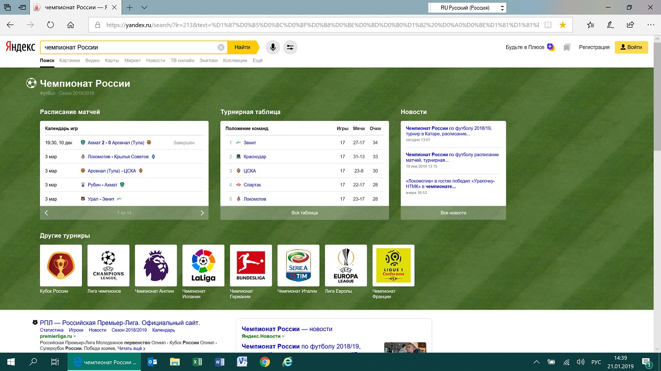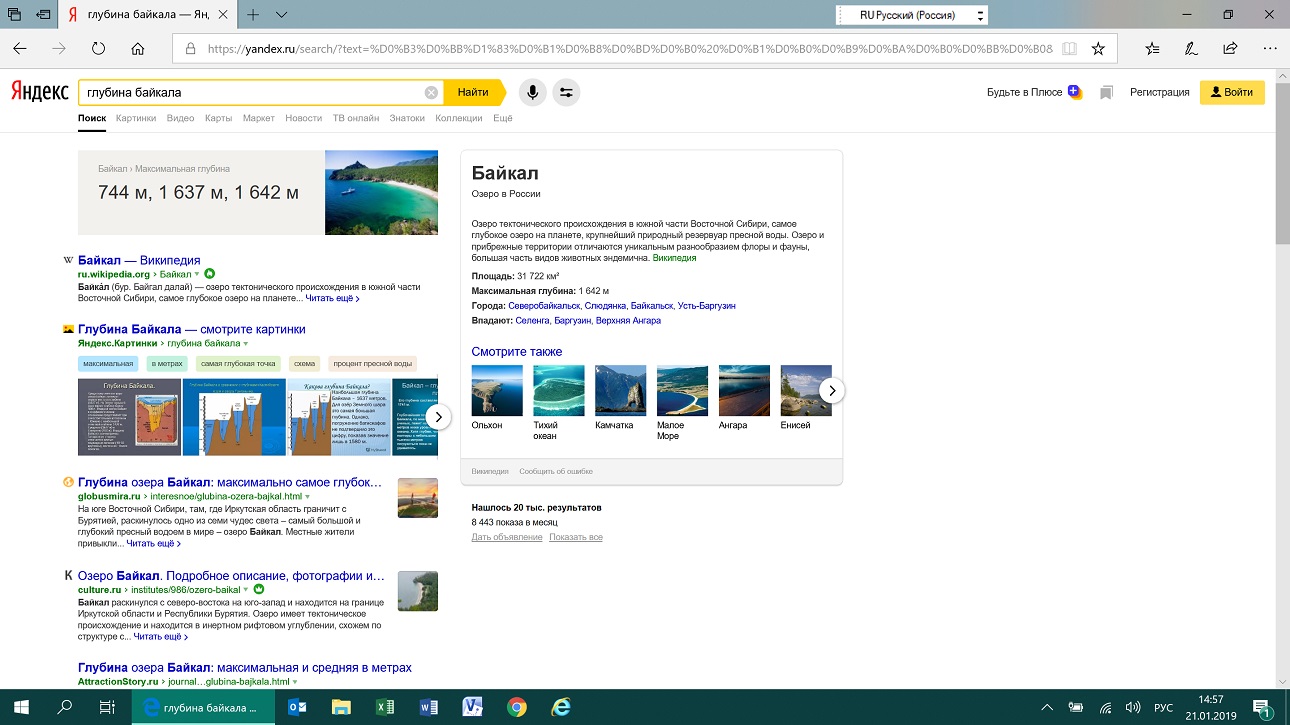 Посмотрите, как уже сейчас, на январь 2019 года Яндекс дает ответ на простые, но популярные вопросы «чемпионат России» и «глубина Байкала». Особо надо обратить внимание на новые форматы. По сути, Яндекс выводит витрины для выбора. Обратите внимание на индивидуальный побор витрин. Вид витрины в обоих случаях различается. Сам выбор формата уже является следствием интеллектуальной обработки запроса. Более того, алгоритм предугадывает наши последующие вопросы плюс придумывает подсказки, что нам могло бы еще понадобиться. Все подсказки как раз и составляют витрину.