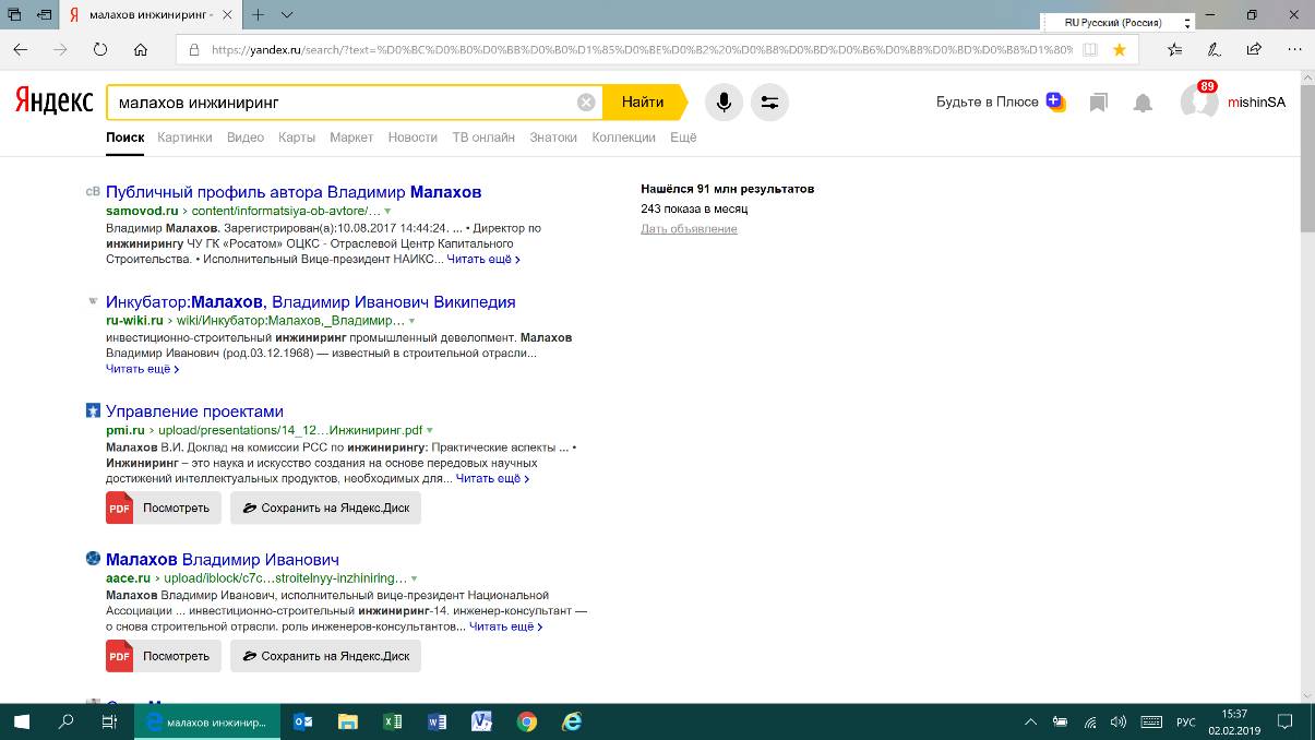 Вот простейший пример. Наберем в Яндексе поисковый запрос «малахов инжиниринг». Существует немало известных людей в России с фамилией «Малахов». В частности, есть медийно известные персоны, мелькающие на федеральном ТВ. В отличие от медийно раскрученных персон есть и другие достойные люди с одноименной фамилией. Так в мире инжиниринга, инвестиционно-строительных проектов Владимир Малахов хорошо известен и как инженер, и как управленец, и как консультант и преподаватель. Он автор свыше сотни публикаций. Яндекс отлично выделяет из сотни миллионов страниц нужного нам Малахова.
