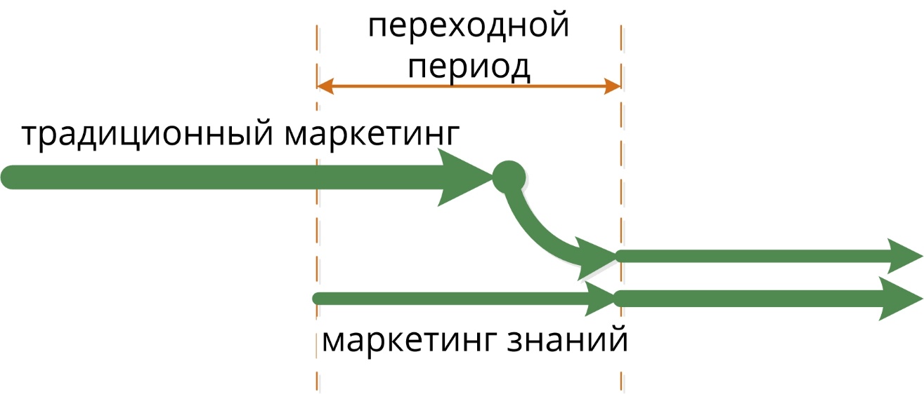 Стоит сразу подчеркнуть: переход к маркетингу знаний не есть одномоментный акт. Маркетинг знаний не включается нажатием волшебной кнопки. Сегодня мы делали рекламу, продвигали бюджетный контент, а уже завтра про все эти методы забудем, работников уволим и начнем переносить знания в открытое пространство. Совершенно очевидно, что маркетинг знаний будет относительно длинное время сосуществовать с другими направлениями маркетинга. В течение этого переходного периода возникнет четкое понимание для данной конкретной компании: от каких инструментов следует отказаться, какие модифицировать, а какие новые инструменты, действительно, нужны данному бизнесу.