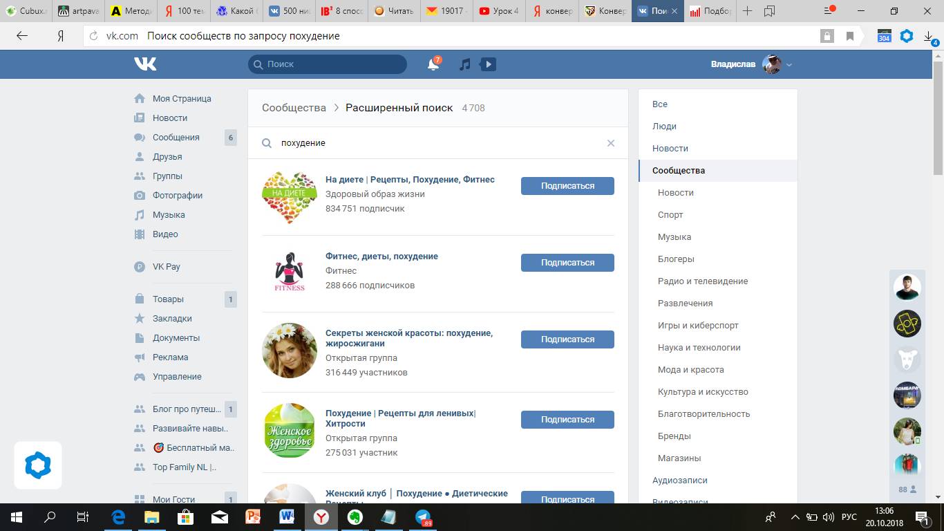 Второй шаг – Найти целевую аудиторию. Для начала можно поискать группы в социальной сети вконтакте на тему похудения, диетологии и лишнего веса, а так же на тему послеродовых проблем, которые обсуждают все женщины в социальной сети.