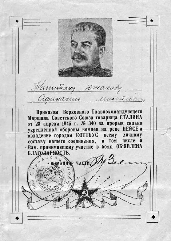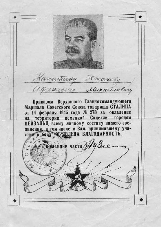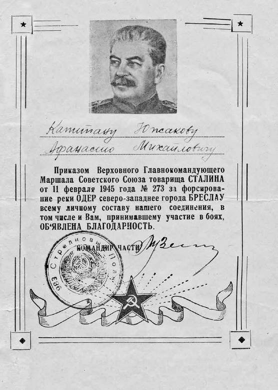 В боях за этот город был ранен и мой друг – начальник химической службы Николай Чапленко. Пришлось оставить его, спрятав в стенной нише, скрытой от обстрела. А я должен был срочно прибыть в дивизию, поскольку нес при себе дивизионное знамя. Командир, увидев символ борьбы и побед нашего подразделения, был доволен. Правда, полотно теперь осталось без древка. Он пожал мне руку и объявил благодарность за спасение боевого знамени дивизии.
