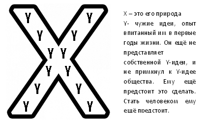 Для нормального вхождения в гетеросексуальное общество человек рождается со всем набором необходимых инструментов: руки, ноги, голова. В первые годы жизни его задача состоит в том, чтобы придать им нужную силу, навыки их применения: ходить, держать ложку, говорить, думать. Затем – учиться, бегать, прыгать. Затем – учиться защищать Родину, перенимать опыт, трудиться. Затем – создать семью, воспитывать детей и т. д. Дело самого индивида – нарастить свою массу, а дело его учителей в каждую упругую мышцу и извилину вставить необходимый У-элемент, как будущий каркас. Этим заведуют воспитатели, учителя, родители, общество, кружки, секции, книги, мультфильмы, кино и т. д. Растущий индивид ХУ-Вселенной выглядит так. Он находится внутри системы, идеи ещё бессознательно и только готовится стать частью общей У-идеи. Будь то государство или футбольная команда, или школьный класс.