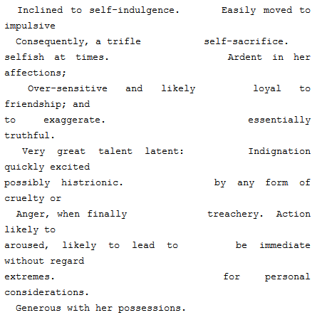 As usual, two separate columns were necessary to record the varied traits so far apparent in her. These traits Cleland noted in the book devoted to memoranda concerning the child, writing them as follows: