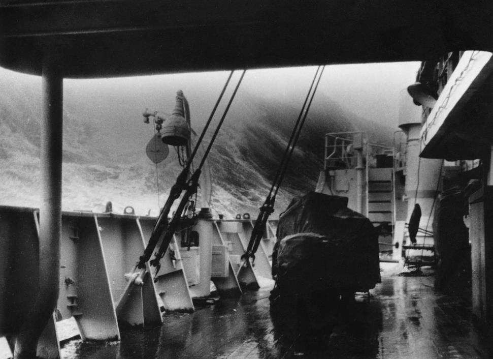 Командир корабля принял решение следовать прежним курсом домой, т. е. навстречу шторму. К вечеру вошли в Бискайский залив, погода испортилась, стало прилично покачивать. Поскольку я ходовой вахты не нес, пошел спать. Ночью проснулся от того, что меня выкинуло из койки, несмотря на защитное ограждение. Очнувшись на полу, я с трудом встал. Качало неимоверно. Попытался зажечь в каюте свет. Он не включался, за бортом раздавался грохот волн. Привычного гула корабельного двигателя не прослушивалось. Кое-как я нашел и натянул одежду, сапоги, фуражку и отправился наверх для уточнения обстановки. В коридоре кают и в других помещениях света также не было. Продвигаться вперед приходилось с использованием цирковых приемов. С трудом выбрался в ходовую рубку. Там узнал, что вышел из строя дизель главной машины, а следовательно, остановился и основной электрогенератор, питающий бортовую сеть, аварийный генератор тоже не запускался. Узнал, что за бортом шторм 11 баллов. Высота волн – 12 метров (Фото 21 ниже). Нас разворачивает лагом, т.е. бортом, к волне. Слава богу, в рубке все агрегаты и приборы получали электроэнергию от аварийных аккумуляторов. Посмотрел на кренометр. Нас клало на каждый борт до 60о, а угол «заката» судна, к нему уже не возвратиться в вертикальное положение, – 72 оС. Положение критическое. В таких условиях не только невозможно ремонтировать двигатель, но и жить не хочется. Это при том условии, что морской болезнью я не страдал и качку переносил нормально. Обездвиженное судно на такой волне и ветре – прямая добыча подводного царства. Сразу вспоминались пушкинские строки: «Плыви, мой челн, по воле волн». А также морские легенды о Бискайском заливе как о «кладбище кораблей». Кроме того, в море виднелись сигналы судов, терпящих бедствие. Тоска!