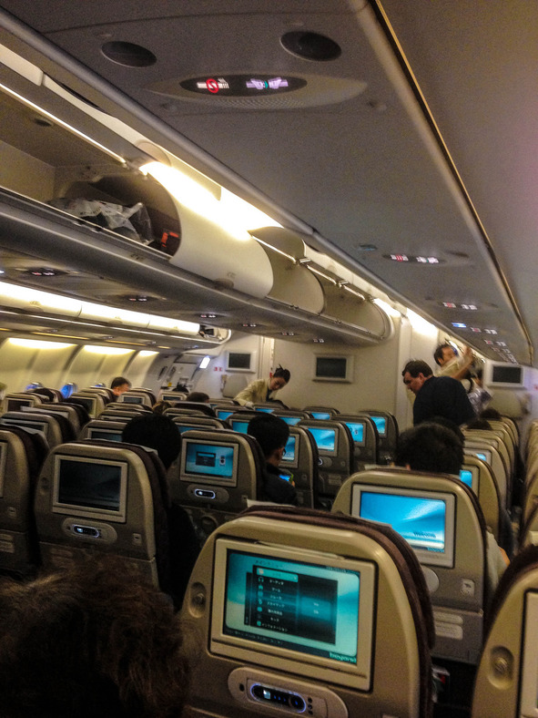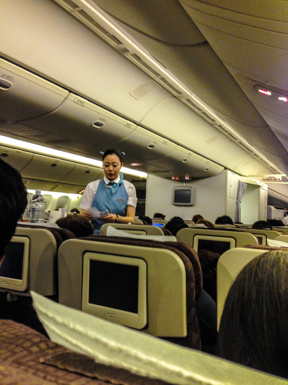 Обслуживание даже получше чем у Эмиратов. Стюардессы все как на подбор высокие (чтоб багажные полки закрывать) и симпатичный (радовать глаза паксов), постоянно улыбаются и трындят загадочное слово sa-ham-ni-da. Я так понял, что это типа как спасибо и вообще слово-связка вроде нашего б*я)))