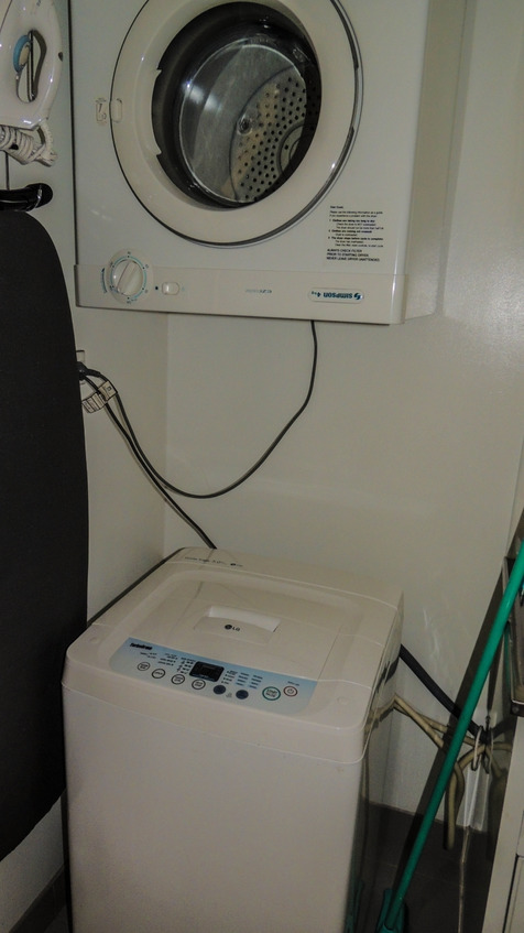 Есть стиралка и такая классная вещь как сушилка. Т.е выстиранную одежду кладешь в верхний барабан и через полчаса она сухая.