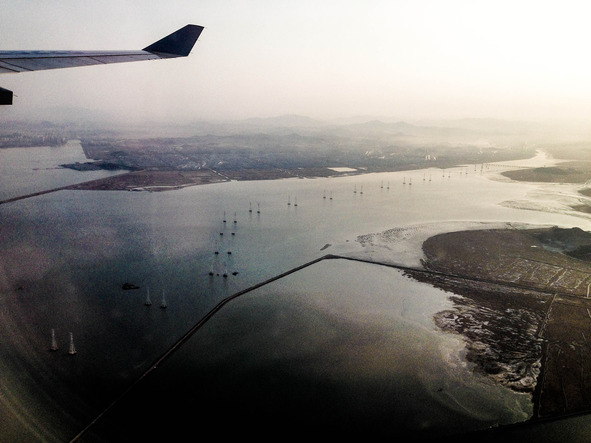 Тем временем заходим на посадку в новенький международный аэропорт Инчон. Виды за окном впечатляют. Сначала подумал, что это трасса для полетов чемпионата пилотов Red Bull. Оказалось ЛЭП