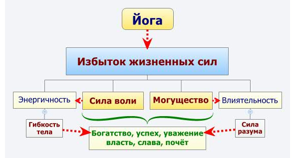 Белее продвинутые разделы йоги учат контролировать свою жизненную силу (прану), осознанно направлять своё внимание и энергию на решение различных задач, легко достигать поставленных целей и силой мысли влиять на окружающий мир! Поэтому человек, который практикует йогу регулярно, становится очень энергичным, волевым, могущественным и влиятельным.