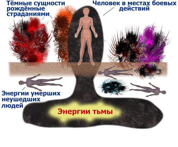 У эгрегоров тьмы есть и ещё одно проявление. В отличие от большинства других тёмных эгрегоров, в них существует и энергетика Тонких Душ тех людей, которые погибали во время боевых действий. Естественно, что далеко не все погибшие оказывались в этих эгрегорах, но как реальный энергетический факт это имеет место. Понятно, что сказать по каким причинам это происходило с некоторыми умершими во время боевых действий людьми, не представляется возможным. Но сам по себе этот энергетический факт говорит о том, что необходимы усилия многих людей, чтобы освободить из этого тёмного плена тех, кому нужна данная энергетическая помощь. Здесь мы подошли к пониманию, которое говорит о необходимости для Земли повышения вибрации людей через их научение методам энергетической работы с собой, и пространствами хотя бы Земли.