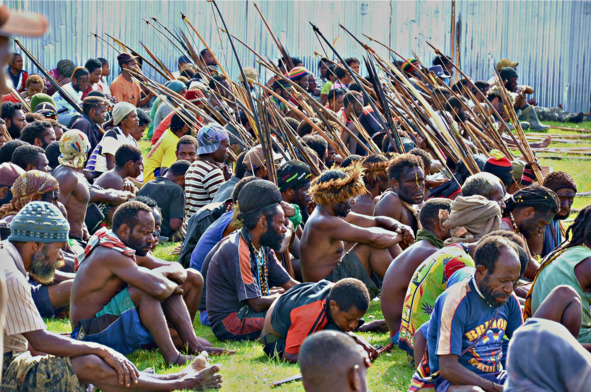 Съехались племена со стороны потерпевших и со стороны подсудимых. И те, и другие в большом горе, чем и объяснялись их угрюмые позы. Выступал прокурор и представители от племён. Действо оказалось долгим и нудным. Целый день люди просидели под солнцем, лишь только венки из перьев казуара защищали их лица. Ящики с бутылками минеральной воды стояли возле людей, и надо думать, что вода там давно выкипела. Жёны подсудимых с цветными сумками-сетками за спиной весь день ходили вокруг площади, ожидая решения суда.