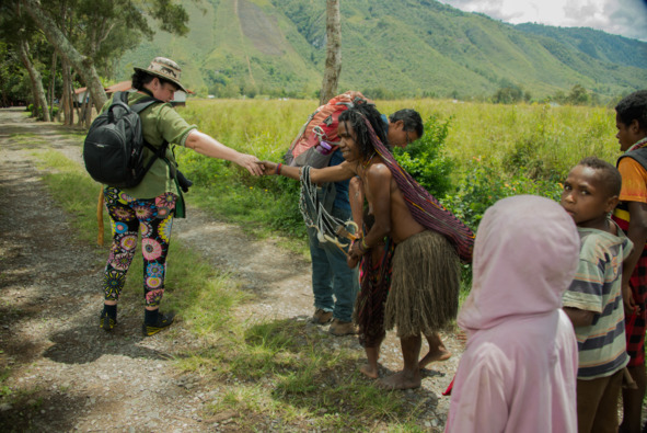 Фотосессия закончилась раздачей денег. Лес рук тянулся ко мне, тут уже все были готовы фотографироваться хоть за наш рубль, чувствуя, что интерес к ним мы удовлетворили. Узкой тропинкой пошли в следующую деревню, и в какой-то момент кто-то осторожно сзади взял меня за руку. Обернулась, конечно, а это тот самый папуас в перьях, которого я изначально обидела, не дав доллар за его фото.