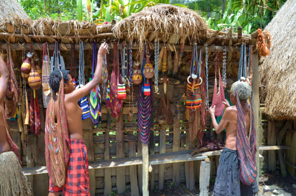В деревне, прямо на заборе из кольев, висели сувениры на продажу. Видимо, витрина никогда не убирается, так как мы приехали внезапно и о своём визите не сообщали. Папуасский спектакль не заказывали, а потому незачем было предупреждать их о нашем приезде. Что такое «папуасский спектакль»? Это представление в течение часа, где показаны сцены традиционных военных действий между племенами. Искусственно созданная ситуация меня не интересовала. Всё как-то натуральная жизнь больше привлекает.