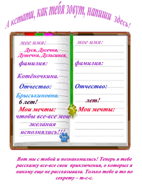 Меня зовут Дуся, а можно Дусечка или Душечка. А когда кто-то на меня сердится, то кричат так: Дуська. Ой, но это происходит не так часто, ведь я самая-самая маленькая в семье. В кошачьей семье! Да-да, в кошачьей семье и со мной живут, а если точнее, то я живу с бабушкой, ой, приехала к ней на лето, а моя бабуля живет с хозяйкой Анюсей, сколько ей лет я не знаю, но то, что она занимается музыкой знаю точно! Каждый вечер Анюся садится за фортепиано и начинает играть красивую мелодию. А я вместе со своей бабушкой сажусь рядом с Аней и наслаждаюсь чудесной музыкой. Ой, чуть не забыла в следующем году я пойду в школу. Я иду в школу, ну, чтобы учиться и все-все знать!