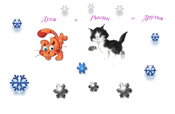 Ой, что-то я заболталась и забыла вам рассказать о своем приключении, так вот слушайте: В воскресное зимнее утро, когда на улице было холодно и дул сильный ветер, я, то есть, Дуся вместе со своим другом Рысиком гуляли во дворе. Мы гуляли и гуляли и поняли, что во дворе очень скучно играть. И мы выскочили на улицу, а там компания собралась еще та. Перечислю их: капризуля кошечка Леди, Серик, модница Кларисса, драчливый кот Борюсик, и любитель петь на наших кошачьих дискотеках маленький кот Буся, почему его зовут так? Так это очень просто – он маленький, как бусинка.