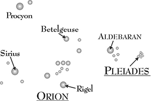 Taurus, the Bull, is a magnificent constellation of the zodiac. Shaped like a Roman five, it rises in the east in a horizontal position and sets in a vertical one. The Hyades – the small jaws of a wolf in ancient Germanic interpretations – form the head of the Bull. The two bright stars below ‘the charioteer’ are the tips of its horns. The back extends along the Pleiades.