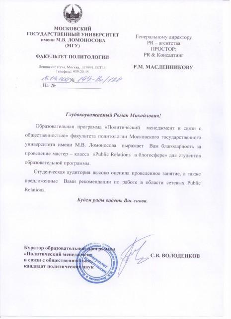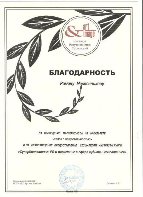 В июле 2012 года проходила практику у Романа Масленникова в PR-агентстве «ПРОСТОР». Перед этим я попала по распределению ВУЗа в ИТАР-ТАСС. Там практикантам-волонтерам (у них там это так называется), предлагалось на выбор – любо крепить значки на сумки, помогая таким образом, готовится к Всемирному медиа саммиту, любо встречать иностранных гостей, прибывающих на это мероприятие. Не стоит и говорить, что такая практика совсем меня не устраивала. Сбежав из ИТАР-ТАСС, стала искать место для практики. Через какое-то время вышла на практику в агентство «ПРОСТОР». И не пожалела! Роман Масленников нещадно нагружал креативной и профильной работой, при этом прислушивался к моим идеям и давал возможность для самореализации. За время практики, я получила много дополнительных знаний о связях с общественностью и устройстве работы пиар-агентства, а главное – смогла с успехом применить полученные знания в деле. Месяц работы в «ПРОСТОРЕ» – это самый лучший учебник по пиар!
