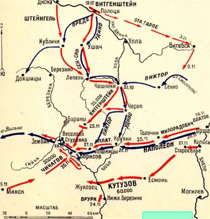 Русские командующие ведут бои на разных берегах Березины каждый за себя. Кутузов находится далеко у Днепра и не влияет на ход сражения. Этим пользуется Наполеон. Он переправляет через Березину боеспособные войска, прочих бросает на восточном берегу. Потери огромны.