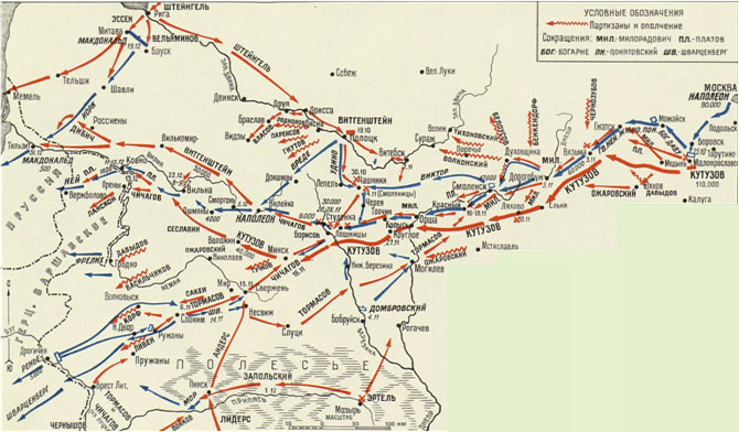 А если обгонять и загораживать дорогу, то не миновать больших сражений, в которых Наполеон большой мастер. Лучше это сделать вместе с Витгенштейном и Чичаговым, имеющим указания сойтись где-то между Минском и Оршей, и встретить отходящего врага. Там будет можно его окружить и уничтожить. А пока идти справа и слева от Наполеона, не давая сворачивать с разорённой Смоленской дороги, замедлять его движение и всё время «отщипывать» малые и большие отряды. Ведь скоро зима, когда холод и голод помогут наносить врагу нужный урон.