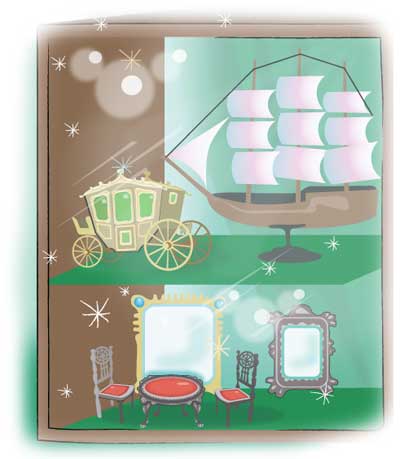 Под стеклом, на тёмном зелёном бархате, стояли вещицы тончайшей выделки. Крошечная золотая карета с изумрудными окошками. Столик с рубиновой столешницей, а к нему – четыре кресла затейливого серебряного кружева. Кораблик из чернёного серебра с перламутровыми парусами и задумчивой русалкой на носу. Поднос с чайным сервизом, до того малюсеньким, что воспользоваться им могли бы лишь сказочные гномы. И ещё – изумительной работы зеркальца, шкатулки, пудреницы, веера.