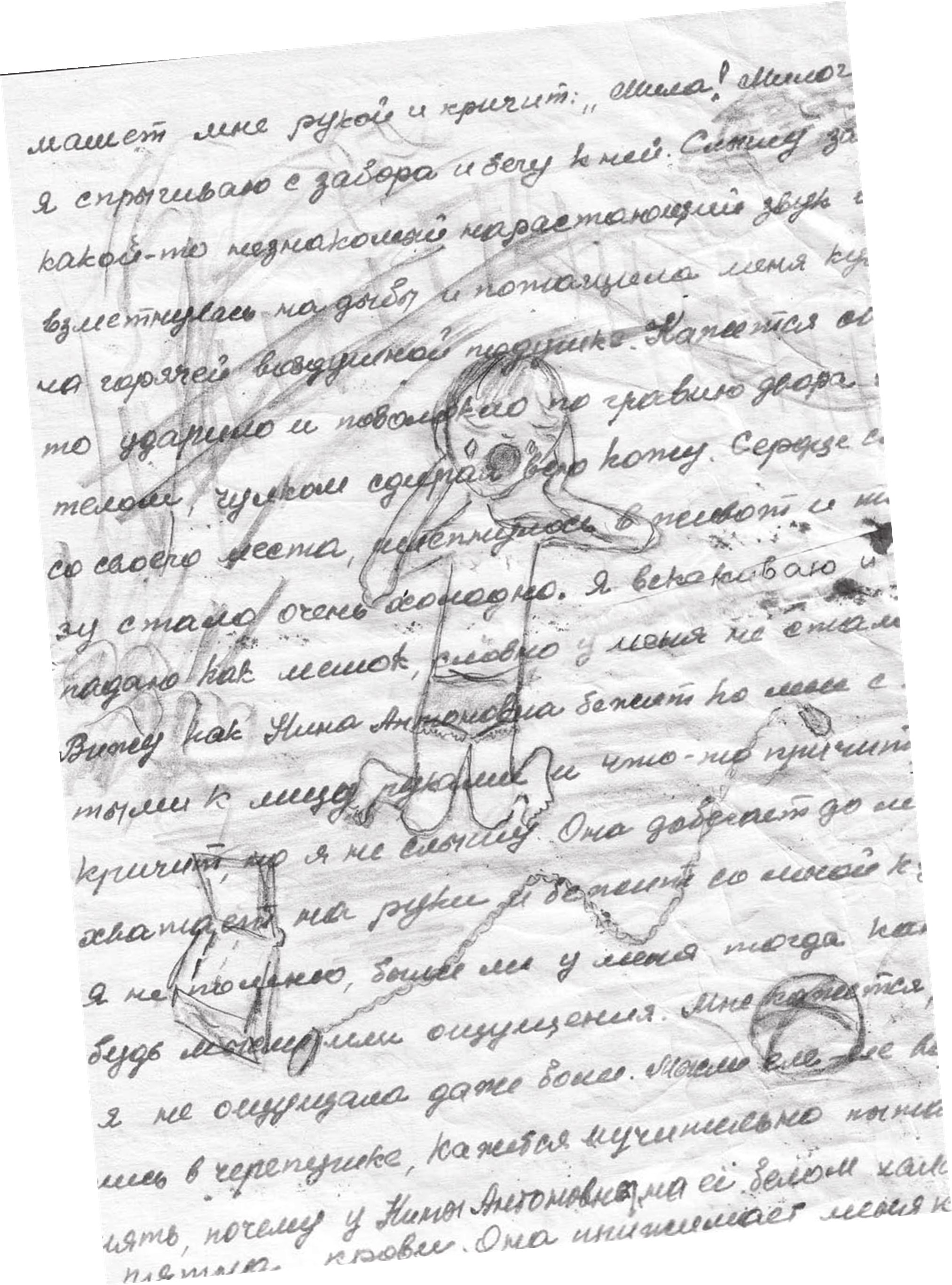 На улице поднялась суматоха. Поднимая неимоверную пыль, громыхали телеги, носились жители и военные. Улица то пустела, то снова заполнялась людьми. Все что-то кричали, вопили, и был слышен истошный мат и громовое «Танки! Танки!». Мы, не зная, что такое «всамделишная» война, бросаемся к забору и глазеем, как взрослые играют в свою взрослую войну. Кругом что-то грохочет, стрекочет, ухает… В промежуток между грохотом услышала, что меня зовут. Оглядываюсь и вижу, как последние дети вбегают на крылечко и в дом, а Нина Антоновна машет мне рукой и кричит: «Мила! Милочка!» Я спрыгиваю с забора и бегу к ней. Слышу за спиной какой-то незнакомый нарастающий звук, и земля взметнулась на дыбы и потащила меня кувырком на горячей воздушной подушке. Кажется, обо что-то ударило и поволокло по гравию двора голым телом, чулком сдирая всю кожу. На меня что-то падало и больно молотило по всему телу, засыпая всякой всячиной. Дым и земля лезли в рот, в нос и глаза… Давило уши, ужасно шумело в голове… Сердце сорвалось со своего места, шлепнулось в живот, и там сразу стало очень холодно. Я вскакиваю и сразу падаю как мешок, словно у меня не стало костей. Вижу, как Нина Антоновна бежит ко мне с прижатыми к лицу руками и что-то кричит, кричит, кричит, но я не слышу. Она добегает до меня, хватает на руки и бежит со мной к дому. Я не помню, были ли у меня тогда какие-нибудь мысли или ощущения. Мне кажется, что я не ощущала даже боли. Мысли еле-еле ворочались в черепушке. Кажется, я мучительно пыталась понять, почему у Нины Антоновны на ее белом халате пятна крови. Она прижимает меня к себе и бежит, бежит, и мне кажется, очень медленно и очень долго. Лицо мое повернуто к забору, где я только что стояла, – и на том месте огромная яма. Ни забора, ни дерева – ничего! Пусто! Дыра! На крыльце уже никого нет, все дети в доме. Мы успеваем преодолеть крыльцо, как снова взрыв, и Н. А. падает вместе со мной, но уже в коридоре. Я как тряпочная кукла в ее руках – немая, глухая, с обвислыми руками и ногами. Меня кладут на матрас возле двери… Странно, вроде у меня ничего не болело, кроме шума в голове, – и вдруг заболело все сразу. У меня разламывается голова, меня тошнит и рвет, жгучая боль в спине и необъяснимая боль в руках и ногах, которые очень туго перевязаны, мне трудно дышать. Наступает запоздалый испуг, и я начинаю плакать. Мне хочется к кому-нибудь прижаться, пожаловаться, как мне больно, хочу, чтобы меня погладили по головке. Но кругом переполох, орут, визжат и плачут абсолютно все дети, а нас много и руки до всех не доходят. Сколько все это продолжалось – не знаю. Теперь уже я не помню, откуда у меня эти знания, что танки прорвались там, где их совсем не ждали. Среди детей было много убитых и раненых. Нашим бойцам удалось оттеснить врага, и нам помогли выбраться из Демянска…
