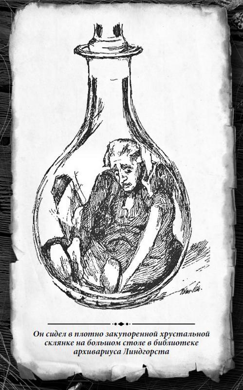 «Как это архивариус может плести такой вздор?» – сказал сам себе студент Ансельм и сел за стол, чтобы начать списывать рукопись, которую архивариус, по обыкновению, положил перед ним. Но он увидел на пергаментном свитке такое множество черточек, завитков и закорючек, сплетавшихся между собою и не позволявших глазу ни на чем остановиться, что почти совсем потерял надежду скопировать все это в точности. При общем взгляде пергамент представлялся куском испещренного жилами мрамора или камнем, проросшим мохом. Тем не менее, он хотел попытаться и окунул перо, но чернила никак не хотели идти; в нетерпении он потряс пером, и – о, небо! – большая капля чернил упала на развернутый оригинал. Свистя и шипя, вылетела голубая молния из пятна и с треском зазмеилась по комнате до самого потолка. Со стен поднялся густой туман, листья зашумели, как бы сотрясаемые бурею, из них вырвались сверкающие огненные василиски, зажигая пары, так что пламенные массы с шумом заклубились вокруг Ансельма. Золотые стволы пальм превратились в исполинских змей, которые с резким металлическим звоном столкнулись своими отвратительными головами и обвили Ансельма своими чешуйчатыми туловищами. «Безумный, претерпи теперь наказание за то, что ты столь дерзновенно совершил!» – так воскликнул страшный голос венчанного Саламандра, который появился над змеями, как ослепительный луч среди пламени, и вот их разверстые зевы испустили огненные водопады на Ансельма, и эти огненные потоки, как бы сгущаясь вокруг его тела, превращались в твердые ледяные массы. Члены Ансельма, все теснее сжимаясь, коченели, и он лишился сознания. Когда он снова пришел в себя, он не мог двинуться и пошевелиться; он словно окружен был каким-то сияющим блеском, о который он стукался при малейшем усилии – поднять руку или сделать движение. Ах! Он сидел в плотно закупоренной хрустальной склянке на большом столе в библиотеке архивариуса Линдгорста.
