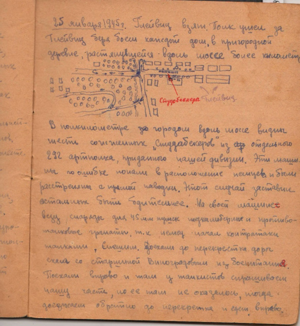 25 января 1945 года город Глейвиц взят. Полк ушёл за город, беря с боем каждый дом, в пригородной деревне, растянувшейся вдоль шоссе более километра. В пол-километре за городом, вдоль шоссе видны шесть сожжённых Американских машин «Студабекер» из отдельного 292-го артполка, приданного нашей дивизии. Эти машины по ошибке попали в расположение немцев и были расстреляны по прямой наводке. Этот случай заставил остальных быть более бдительными. На своей машине везу снаряды для 45 мм пушек и противотанковые гранаты, так как немец начал атаковать нас танками. Спешим доехать со старшиной Виноградовым до расположения нашего полка. Наше внимание привлекают четыре человека, движущихся в нашем направлении по кювету шоссе. Автоматы держим наготове. Люди приближаются, различаем наших двух солдат из полковой разведки, ведущих двух пленных фолькштурман. Наши солдаты машут нам, чтобы мы немедленно возвращались обратно, так как недалеко немцы. Разворачиваю машину, старшина Виноградов узнал от них, где находится наш полк. Вижу по взволнованному лицу старшины, что мы были в тяжёлом положении, едва не попав в лапы к немцам. Кое-как находим обозы наших батальонов и раздаём им боеприпасы. Заночевали в лесу в пригороде местечка Глейвиц. Наутро узнаём, что наш полк соединился с соседним полком 374, ликвидировав небольшую группу фрицев. Затем нас сменяет другая группа, чтобы опять продолжать развивать успех наступления, ликвидируя по пути очаги сопротивления. Весь полк возвращается в Глейвиц, чтобы после небольшой передышки вести новые бои на другом участке фронта, отвоёвывая город за городом немецкой Силезии.