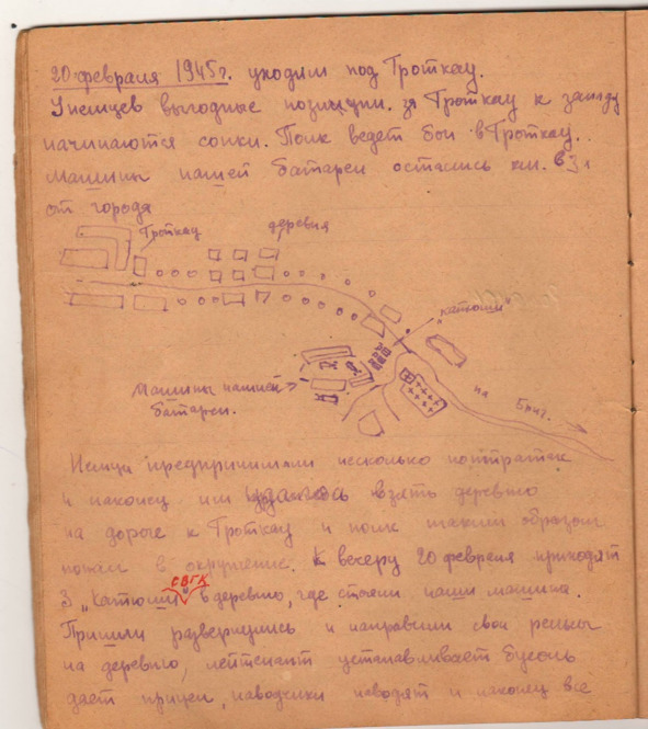 Немцы предприняли несколько контратак и им удалось взять деревню на дороге к Гроткау. Наш полк оказался в их окружении. К вечеру 20 февраля к нам приходят три «Катюши» в деревню, где стояли машины нашей батареи. «Катюши» направили свои рельсы на деревню, где находились немцы, лейтенант устанвливает прицел буоль и даёт солдатам координаты прицела. Наводчики наводят рельсы по заданным координатам и наконец всё готово к залпу по врагу. Стали ждать подходящий момент для стрельбы. К позиции немцев стали подходить танки. Расчёты «Катюш» наготове, лейтенант командует: – «Расчёт в укрытие!», все бегут за церковную ограду, находящуюся в 15—20 метрах от машин. Лейтенант залазит в кабину «Студобекера» и опускает бронещитки на стекла машины. Затем послышалось зловещее шипение и столб пламени упёрся в землю и, как огненные стрелы полетели снаряды в небо и скрылись в нём. Через несколько мгновений послышались беспорядочные взрывы снарядов, несколько танков немцев загорелись и отдалённая деревня опять стала нашей. 21 февраля пришли наши танки и, Гроткау был освобождён, немцы были отброшены к городу Альт-Гроткау, в 5 км от Гроткау. Наш полк меняет другая часть, а мы покидаем Гроткау. Полк основательно потрёпан, насчитывает от силы 200 человек пехоты, не считая тылов. Перебрасываемся на другой участок к городу Бреслау на Одере. Вот уже более месяца идёт штурм этой твердыни. Над гордом дым и грохот бомбёжки. Полку поставлена задача – сдерживать немцев, стремящихся прорваться и соединиться с бреславской группировкой. Подходим к сопкам и занимаем оборону в 15 км западнее Бреслау. Здесь мы берём деревни Штейн и Вольтскирх у подножья большой горы, наверху которой стоит Кirх (моностырь) Вольтскирх, несколько раз переходящий из рук в руки. Командующий артиллерией корпуса приказал:– «Стереть с лица земли». После бомбёжки с воздуха и огня артиллерии деревня Вольтскирх превратилась в груду развалин.