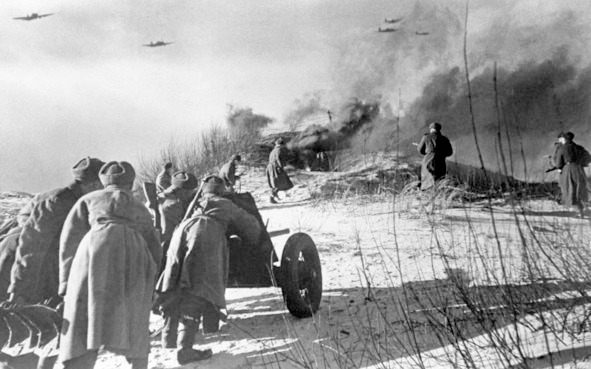Советские артиллеристы с 45-мм пушкой 53-К и пехота атакуют вражескую огневую точку на возвышенности населённого пункта Вольтскирх.