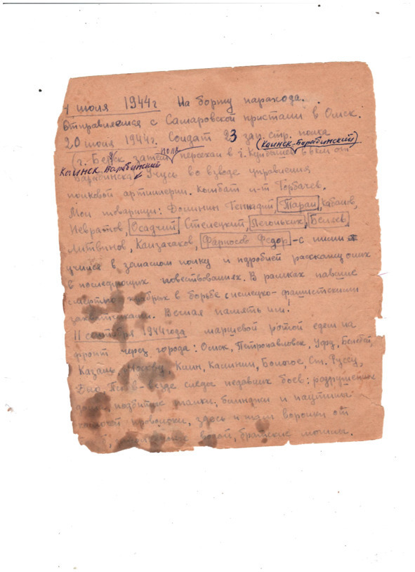 20 июля 1944 года становимся солдатами 23 запасного стрелкового полка в г. Бердск. Затем полк перевели под г. Куйбышев, в 6 км. от г. Барабинска. Учусь во взводе управления полковой артиллерии. Наш комбат лейтенант Горбачёв. Мои товарищи: Долинин Геннадий, Таран, Кабанов, Невратов, Осадчий, Стелецкий, Лёгоньких, Беляев, Литвинов, Канзачаков, Фарносов Фёдор – с ними учился в запасном полку и подробней расскажу о них в последующих повествованиях. Многие из них пали смертью храбрых в борьбе с немецко-фашисткими захватчиками. Вечная память им!