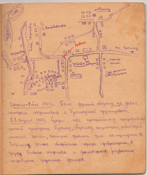 1 апреля 1945 года занимаем оборону западнее Бреслау в 15 км, влево от нас находится Нейсе, вправо, на склоне предгорий, находятся Судет, Цобтен, Швайдинц. Командный пункт полка расположился в деревне Ранкау, тылы полка в деревне, левее в 5 км, батальон капитана Юдакова расположился в д. Вольтаскирх (вернее в развалинах её) и только часовня, изглоданная снарядами и осыпанная, как оспой пулями, с оставшейся черепицей возвышалась над развалинами.