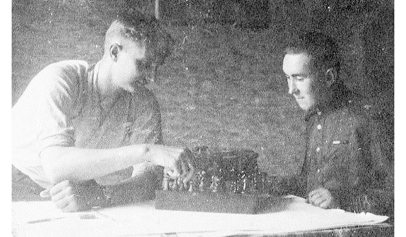 Временное затишье на Западном фронте, редкая минута отдыха. Герман и командир полка И. И. Баранов отвлеклись игрой в трофейные шахматы. Кто победил, неизвестно.