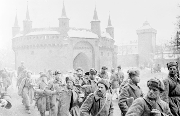 Первые советские пехотинцы на улицах Кракова, январь 1945 года.