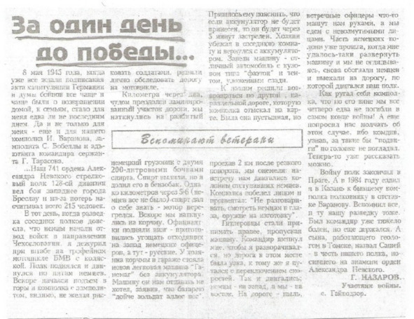 Войну полк закончил в Праге. В 1984 году, я ездил в Казань для встречи с бывшим комполка, полковником в отставке Иваном Ивановичем Барановым. Вспомнили все наши фронтовые пути – дороги и ту нашу разведку тоже. Командир был тяжело болен, но ещё мужественно держался при встречах с однополчанами нашего героического 741- го полка. Своего сына, работающего геологом в Томске, назвал Александром, в честь Александра Суворова, орденом которого был награждён наш полк. Этот последний день войны навсегда запомнился в моей не ослабевающей памяти, о всех днях войны, выпавших на мою молодую жизнь, закалённую в горниле войны.