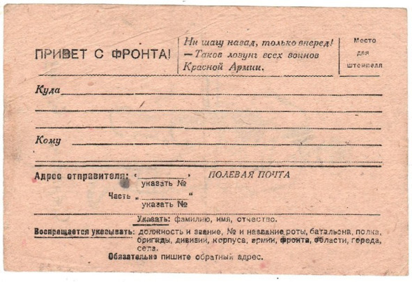 В руках держу уникальные и бесценные полуистлевшие листы почтовых извещений: «Привет с фронта!» /Ни шагу назад, только вперёд – таков лозунг всех воинов Красной Армии./ Я как будто нахожусь в том времени рядом с братом Дмитрием и, он сейчас пишет весточку домой! На обратной стороне этих извещений рисунки 1943года: «Моя постель» 06/02, «Сергеев несёт дрова» 06/02, «Наша печка» 06/02, «Кирилов с гармошкой» 07/02,«Кулебякин у землянки» 06/11, Кулебякин пошёл на обед» 15/11, «Патрушев» 01/11.