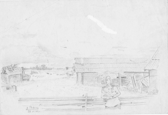 Следующий по времени написания в альбоме хорошо сохранился рисунок, датированный 25 июня 1944 года деревня Равонь.