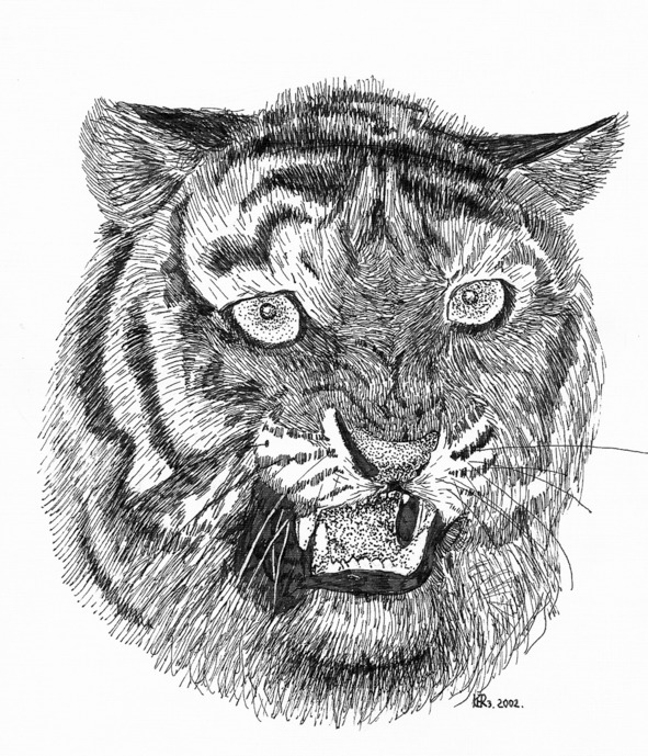 Рисование тушью тонкими четкими штрихами доставляет мне огромное удовольствие. Заметна любая ошибка, исправить ее можно только при помощи перочинного ножа, который, конечно, оставляет след на бумаге, но так приятно, едва надавливая на кончик рапидографа, прорисовывать пряди шерсти и перья, работать над мельчайшими деталями. На один рисунок уходит до восьми или даже десяти часов, терпение требуется огромное, но результат мне нравится, и я считаю, что игра стоит свеч.