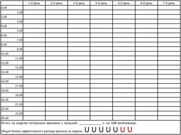 Время – это деньги. Поэтому ведите ежедневный учёт времени и каждый вечер отмечайте в специальной таблице с помощью галочек, крестиков, заштриховываний, сердечек, букв или любых иных обозначений, сколько часов в день вы были заняты делом (тем, что ведёт вас к поставленным целям), сколько часов в день вы работали над собой (физические упражнения, дыхательные упражнения, развитие интеллекта, совершенствование профессионального мастерства), сколько часов у вас ушло на сон и сколько часов вы мило общались с близкими вам людьми. А в конце недели посчитайте, сколько всего времени вы потратили с пользой (при этом, сон и милое общение в кругу семьи без выяснения отношений записывайте туда же в качестве обязательных вложений в своё здоровье и благополучие):